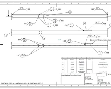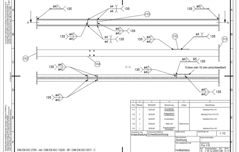 Wir liefern Ihnen sämtliche Fertigungsunterlagen von der Baugruppenzeichnung über Einzelteilzeichnung bis hin zu Schweißanweisungen. Hierbei werden alle notwendigen normativen Angaben berücksichtigt die Sie für Ihr Projekt benötigen.